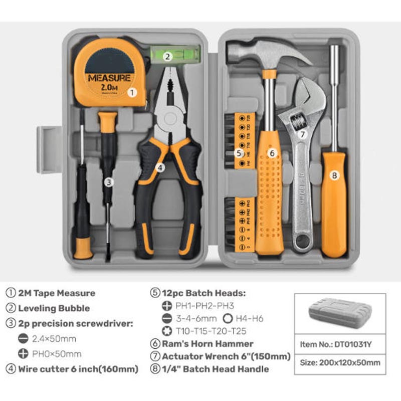 MARSHINE 20-delade manuella hydrauliska hårdvaruverktygsset har två dedikerade precisionsskruvmejslar som kan hantera de små fästena i elektroniken eller leksakerna, medan en 160 mm trådskärare rent kan klippa av koppartrådarna eller de plastbelagda trådarna. Och verktygsuppsättningen har också ett 2,0 M måttband för noggranna längdkontroller, en utjämningsbubbla för att säkerställa raka installationer, en 150 mm ställdonnyckel för muttrarna och en hammare med ramshorn för lätt knackning eller spikarbete.