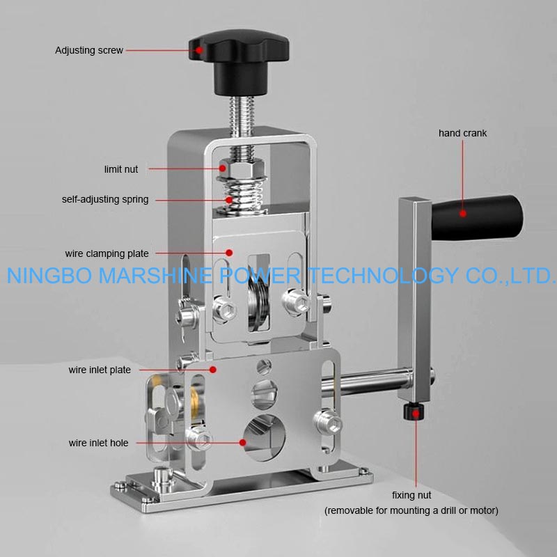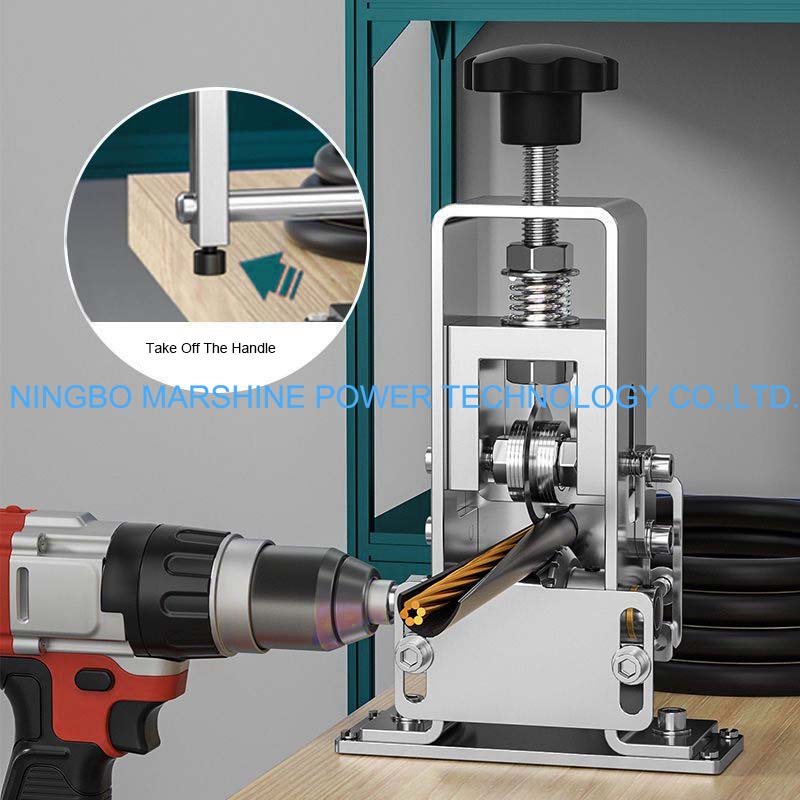 Vår MARSHINE handvevade stålram bärbara trådavisoleringsmaskins arbetsprincip är att använda blad för att strippa tråd, utan behov av värme eller eld. Den här trådavdragaren är manuell trådavdragare formad av en solid stålram, med manuell handvev, den kan fungera bra med strippning, men utan elektricitet. Den är perfekt för att ta bort koppartrådarna från kabeln för återvinning eller återanvändning eller återförsäljning. Det justerbara bladsystemet och det breda utbudet av trådstorlekskompatibilitet gör detta verktyg extremt kostnadseffektivt och praktiskt för elektriker, verkstäder och återvinningscentraler.