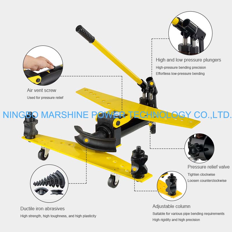 Denna MARSHINE SWG manuell typ av hydraulisk rörbockningsutrustning tillåter en mängd olika bockningsdynor för olika rördiametrar som används vid konstruktion och elarbeten, etc.